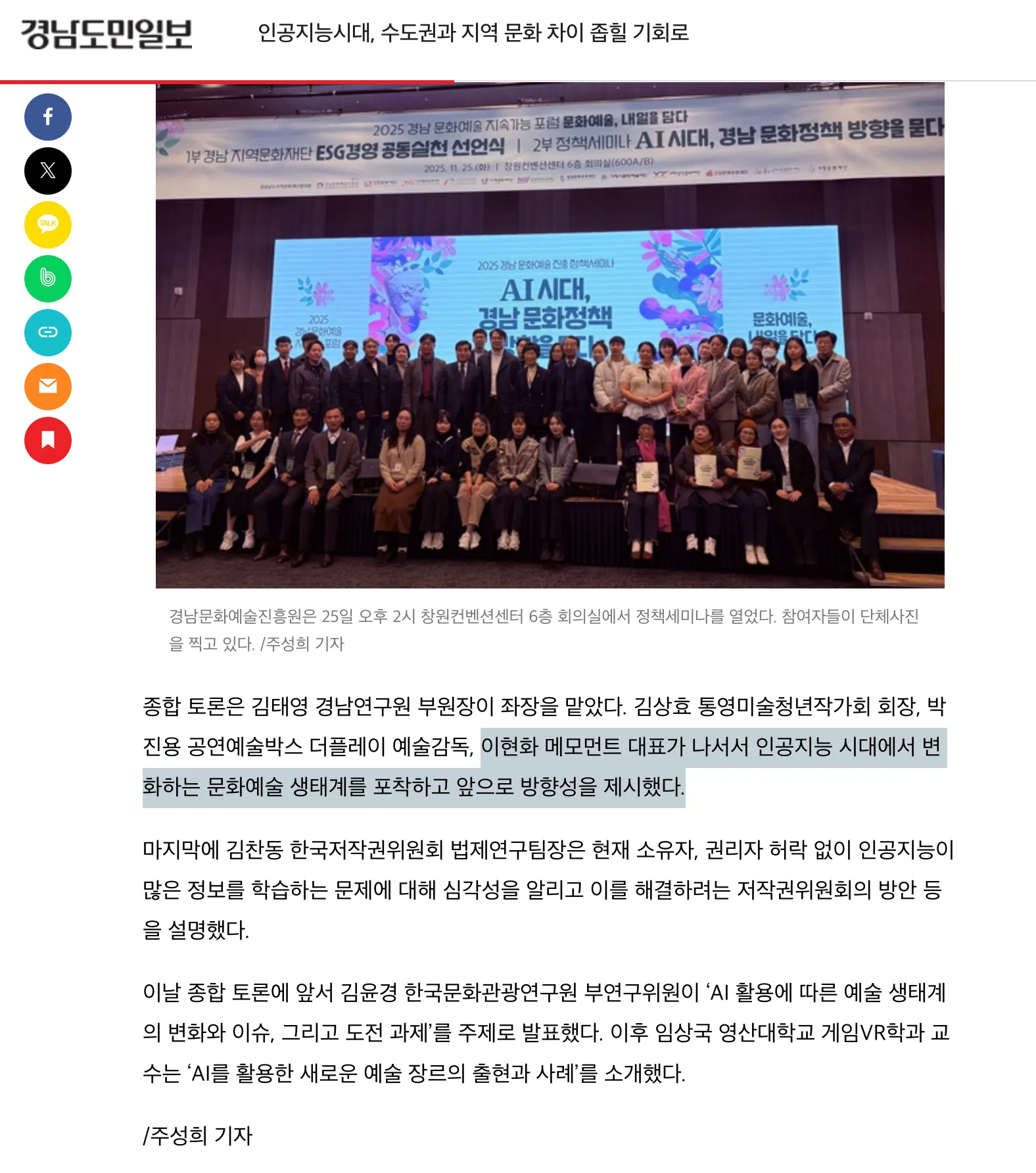지난 25일 창원컨벤션센터에서 열린 ‘AI시대, 경남 문화정책 방향을 묻다’ 정책 세미나에 메모먼트의 이현화 대표가 종합토론 패널로 참석했습니다.